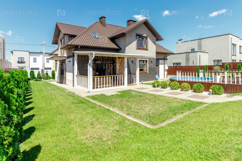 На фотографии изображен прекрасно благоустроенный задний двор с приподнятым бассейном, окруженным зеленью и удобной зоной отдыха