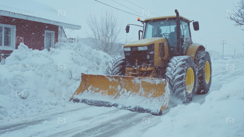 Снегоочиститель расчищает дорогу от снега ярким морозным зимним утром