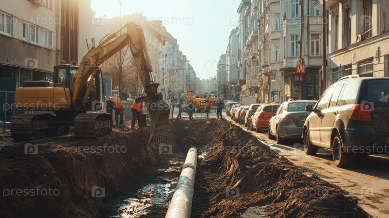 Экскаватор работает при свете раннего утра, окруженный припаркованными автомобилями и кучами грязи, иллюстрируя развитие городской инфраструктуры