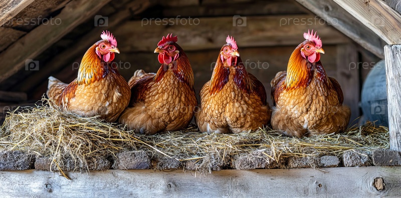 В тепле деревенского амбара куры собираются вокруг только что снесенных яиц, олицетворяя мирную сущность сельской фермерской жизни