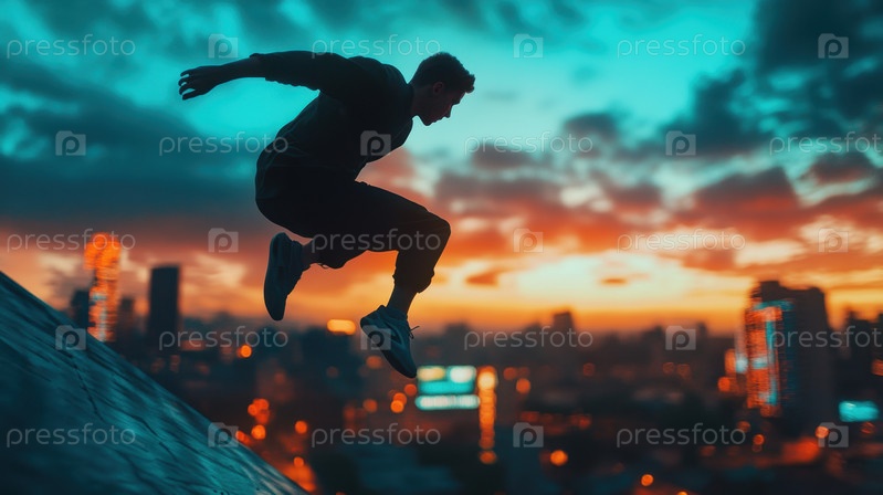Городской паркур: динамичный прыжок на фоне закатного горизонта города