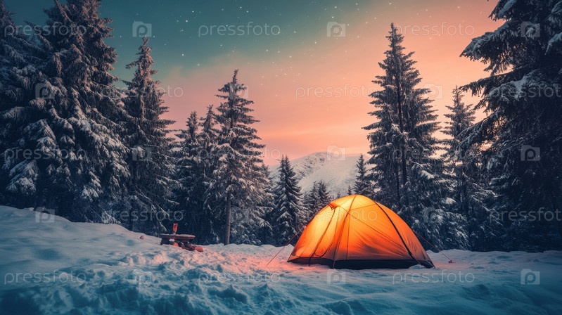 Светящаяся палатка посреди звездной зимней лесной ночи