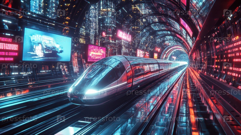 Футуристический поезд Hyperloop в туннеле Neon City