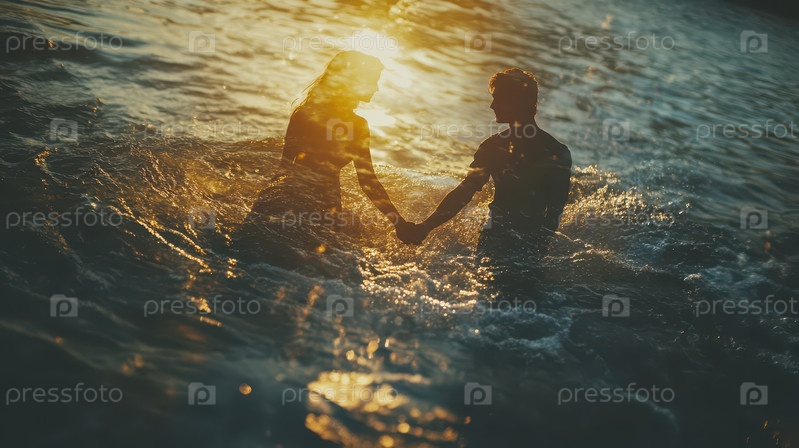 Пара держится за руки на закате с двойной экспозицией
