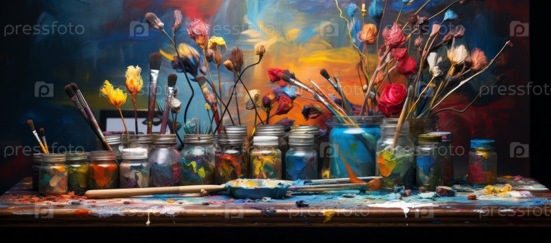 Изображение набора художественных принадлежностей, включающего цветные карандаши, краски, кисти и альбом для рисования