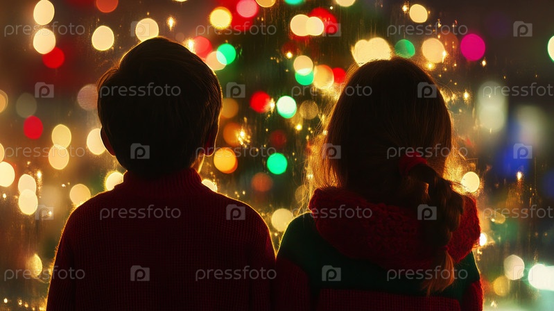 Двое детей смотрят в окно на ярко освещенную рождественскую елку, полные удивления перед праздником