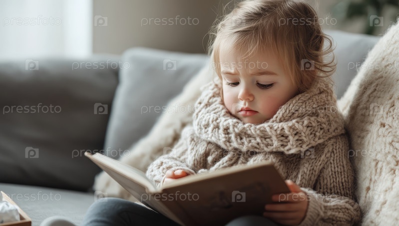 Ребенок, одетый в теплый вязаный свитер и шарф, наслаждается чтением книги, создавая уютную и гостеприимную атмосферу