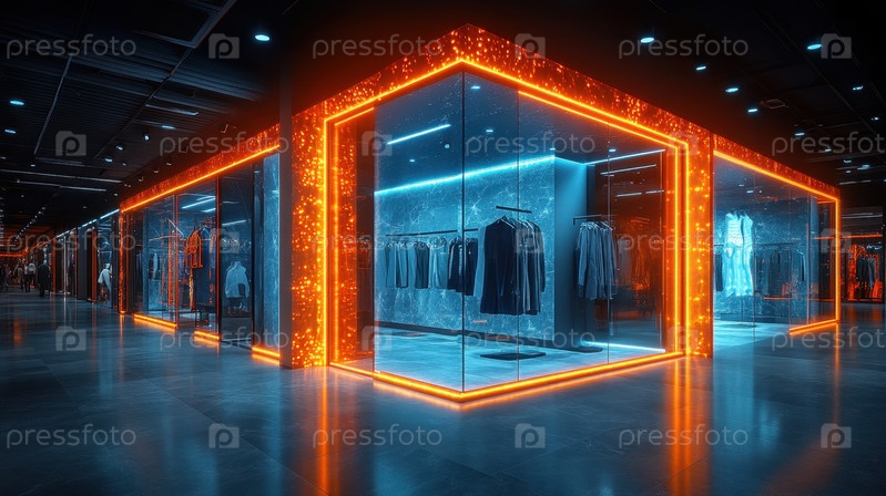 На этом ярком изображении изображен современный модный бутик с яркими неоновыми огнями и элегантными стеклянными фасадами, идеально подходящий для иллюстрации перспективной розничной торговли
