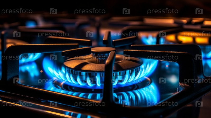 Детальный вид газовой плиты с синим пламенем во время приготовления пищи в интерьере кухни