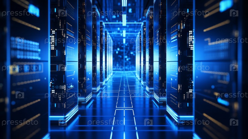 Генеративный коллаж с использованием искусственного интеллекта, изображение, фотография интерьера центра обработки данных с высококачественной защитой серверного хранилища