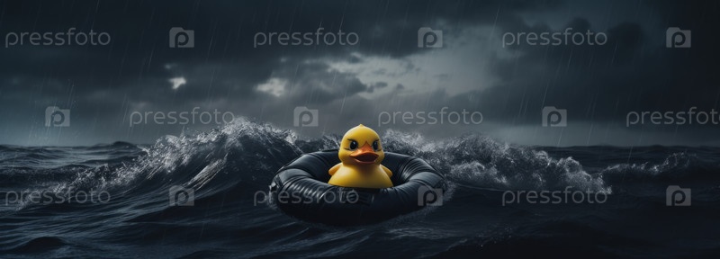 Желтая резиновая уточка плещется в воде и наслаждается волнами