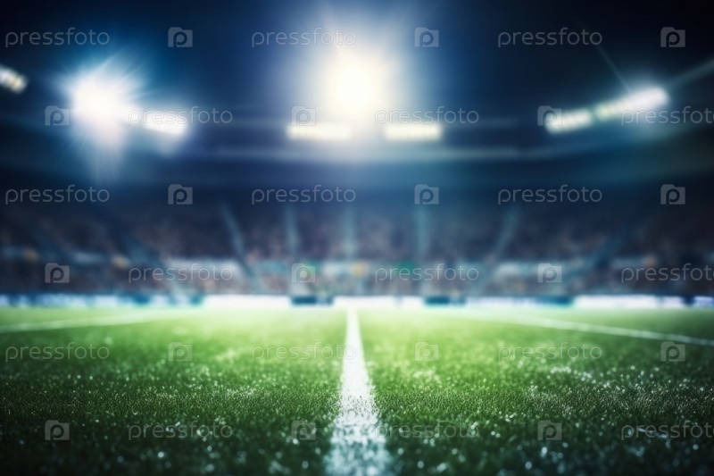 Пустой футбольный стадион с пышной зеленой травой на переднем плане, демонстрирующий огромные просторы спортивной арены