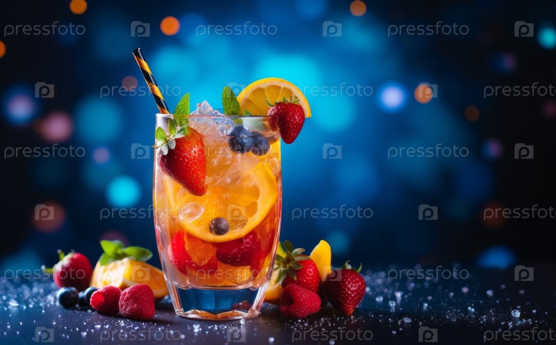 Освежающий разноцветный фруктовый коктейль со льдом, лимоном и мятой в баре, вечеринка в ночном клубе с прохладительными напитками