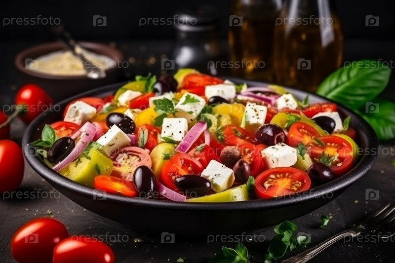 Красочный салат с листьями салата, помидорами, огурцами, морковью и сыром с бутылкой заправки