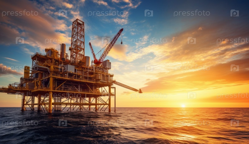 Буровая установка для добычи нефти в океане под закатным небом