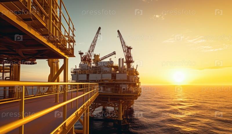 Буровая установка для добычи нефти в океане под закатным небом