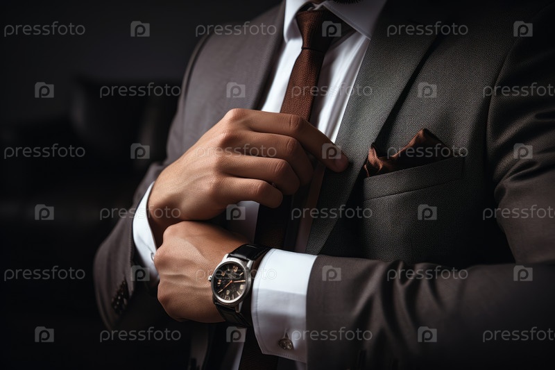 Крупный план мужской руки в костюме, поправляющей запонки руками, концепция одевания мужчин