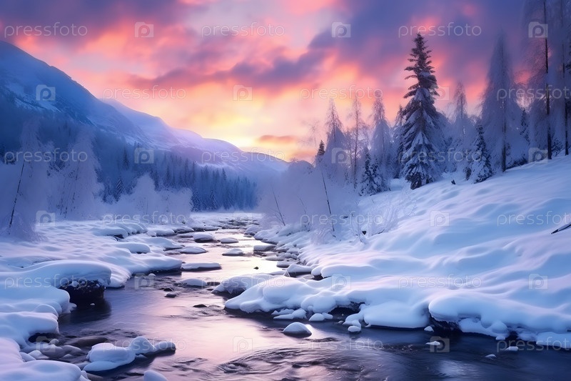 Горы озеро зимний сезон снежный закат пейзаж красивая природа визуальная концепция ai