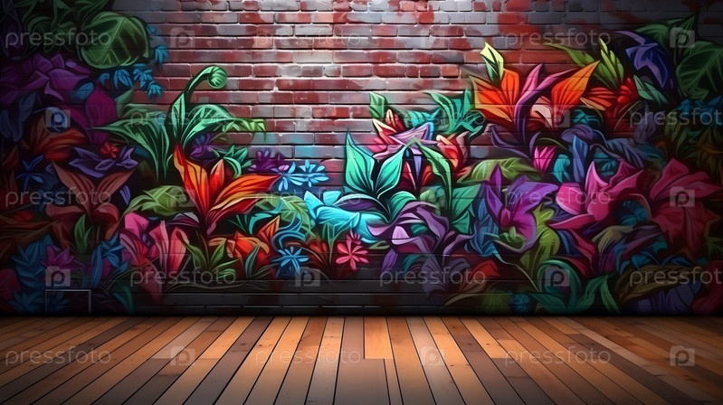 Цветы в горшке на фоне красочного граффити на стене