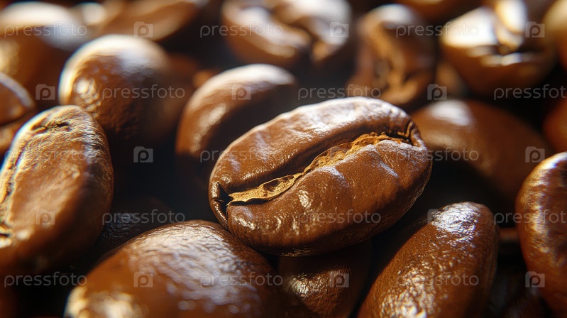 На этом снимке жареные кофейные зерна запечатлены очень крупным планом, подчеркивая их насыщенный коричневый цвет и детализированную текстуру