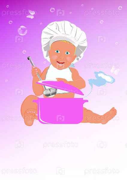 Малыш-повар с кастрюлей и половником на абстрактном розовом фоне. Здоровое детское питание