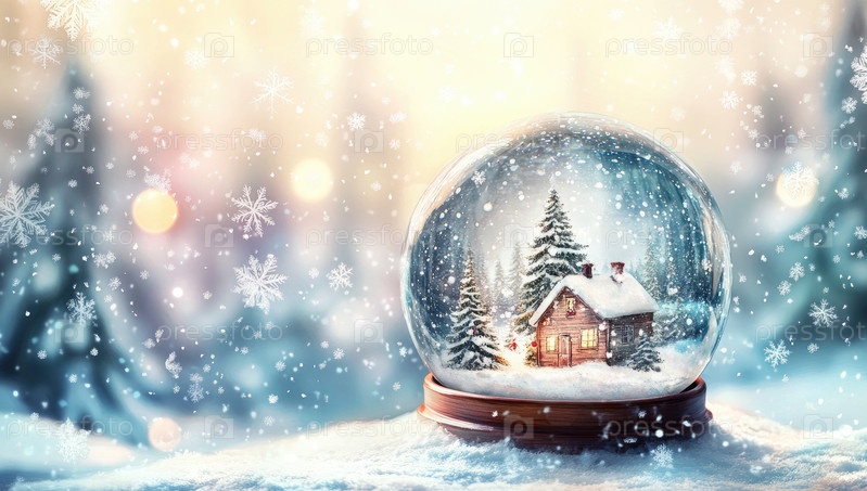Зимняя страна чудес со снежным шаром, домиком и вечнозелеными деревьями