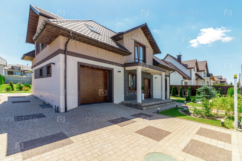 Современный загородный дом с просторной подъездной дорогой, гаражом и ухоженным садом в солнечный день