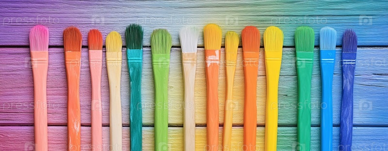 Красочная композиция из кистей на фоне расписных деревянных панелей