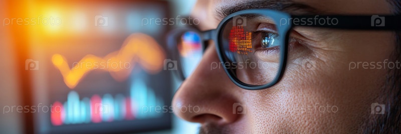 Крупный план глаза в очках, отражающего данные с нескольких экранов, что символизирует аналитический фокус