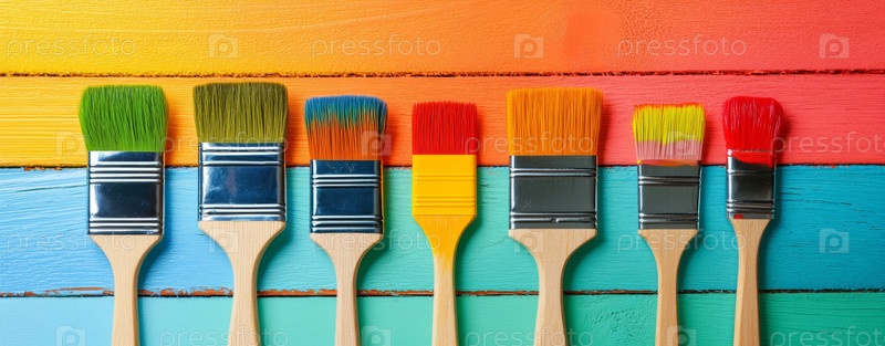 Красочная композиция из кистей на фоне расписных деревянных панелей