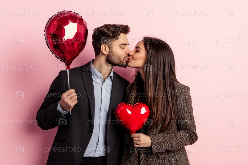 Романтическая пара с воздушным шаром в форме сердца на розовом фоне