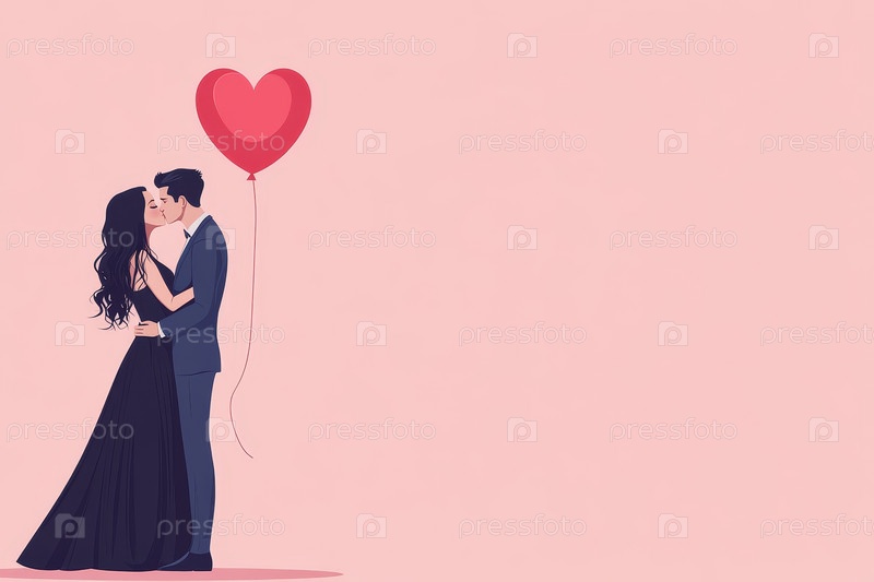 Пара нежно целуется, держа в руках воздушный шар в форме сердца на нежно-розовом фоне