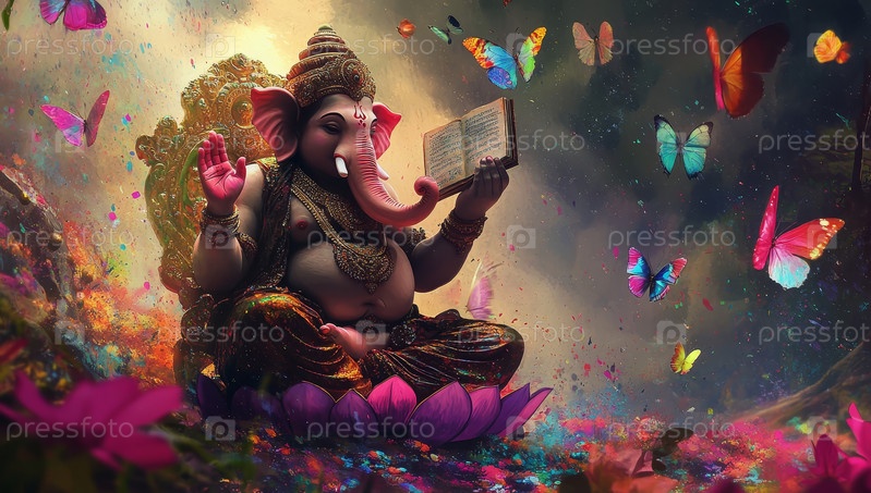 Яркая духовность с Ганешей и красочными бабочками в воздушной сцене лотоса
