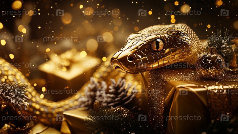 Золотая змея среди сверкающих огней и праздничного декора
