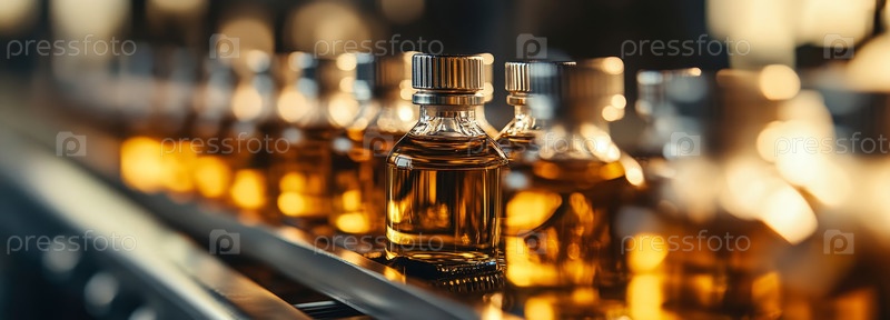 Элегантные флаконы духов на выставке, улавливающие золотистый свет