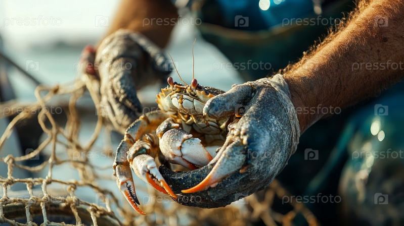 Рыбак держит в руках в перчатках только что пойманного краба, понимая суть морского промысла