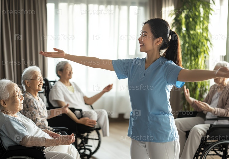 Заботливый медицинский работник проводит групповые упражнения для благополучия пожилых людей