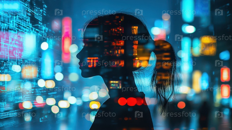 Женский силуэт на фоне неоновых городских огней в двойной экспозиции