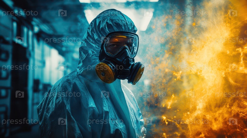 Человек в защитном костюме с противогазом в опасной среде