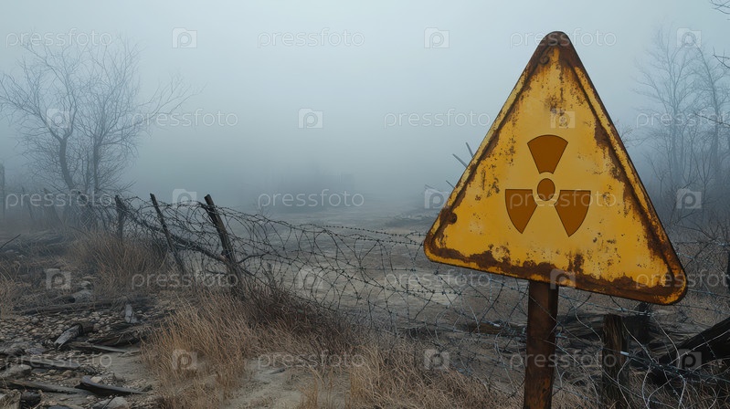 Заброшенная токсичная зона с радиоактивным знаком и колючей проволокой