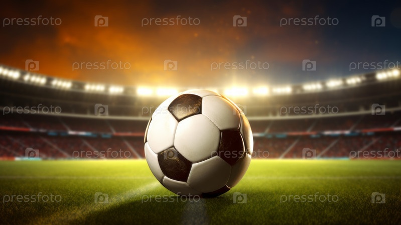 Изношенный футбольный мяч на траве стадиона с протекающим светом