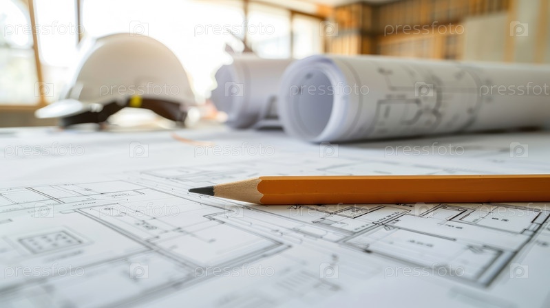 Архитектурное рабочее место с чертежами, карандашами и защитной каской при дневном свете