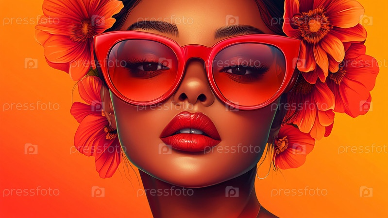 Яркий портрет с цветочным головным убором на оранжевом фоне