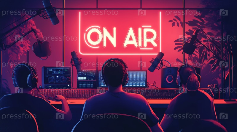 Это яркое изображение передает динамичную атмосферу профессиональной радиостудии с винтажным микрофоном, неоновыми огнями и современным аудиооборудованием, идеально подходящим для трансляций, подкастов и живых выступлений
