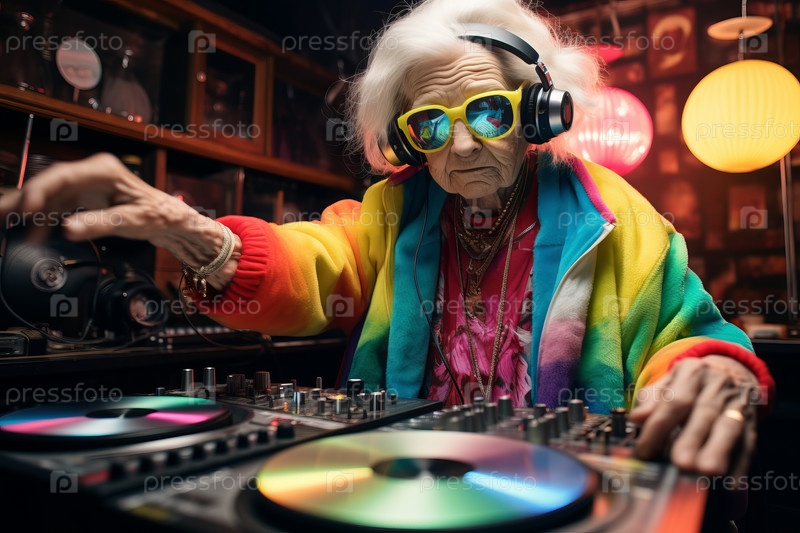 Удивительная бабушка-диджей, пожилая дама играет диджеем и развлекается в стиле диско