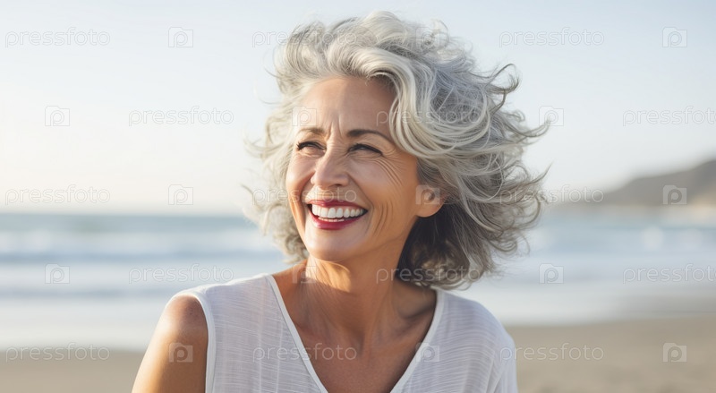 Портрет улыбающейся женщины, закутанной в одеяло на пляже