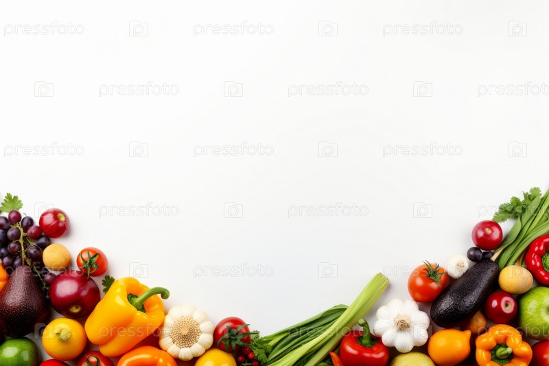 Композиция из фруктов и овощей, изолированных на белом фоне. Красивая широкая рамка со свободным пространством для текста. Коллаж