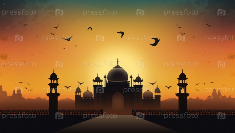 Иллюстрация силуэта индийского дворца с летящими птицами на фоне заката