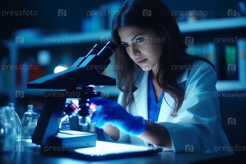 Женщина-ученый внимательно изучает образцы под микроскопом в лаборатории
