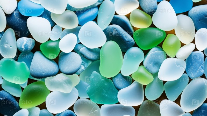 Яркие, красочные стеклянные драгоценные камни сверкают на солнце на песчаном пляже с видом на океан